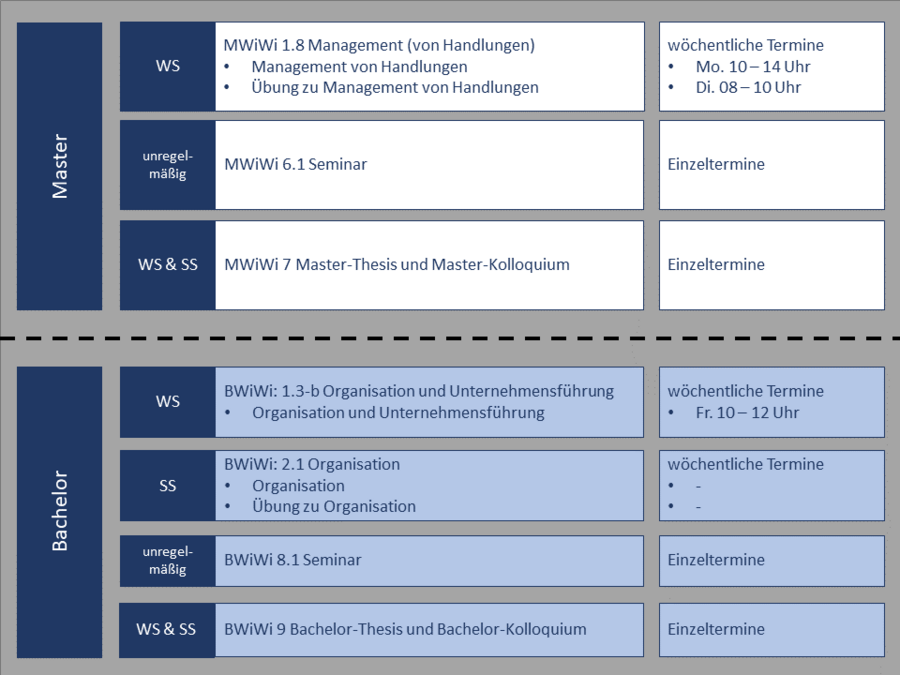 Unsere Lehre bereitet Studierende auf akademisch geprägte Tätigkeiten in der Unternehmenspraxis vor. Eine solche Vorbereitung ist genau dann gut, wenn sowohl fundierte fachliche Kenntnisse als auch analytische Fähigkeiten vermittelt werden. Entsprechend bilden Organisationsstrukturen und deren Veränderung genauso wie das Management von Human Ressourcen den Kern. Angereichert wird dies durch zahlreiche Fallbeispiele und Bezugnahme auf aktuelle Diskussionen. Dies mündet in ein tiefes Verständnis der vielfältigen Facetten von Unternehmen und Organisationen. Analytische Fähigkeiten fokussieren wir durch eine starke Aktivierung der Studierenden. Nur mit einer fortwährenden Hinterfragung lassen sich die verschiedenen Theorien, Modelle und Konzeptionen auf die hochgradig unterschiedlichen Situationen in der Praxis anwenden. Diskursiv ausgerichtete Veranstaltungen simulieren genau das.